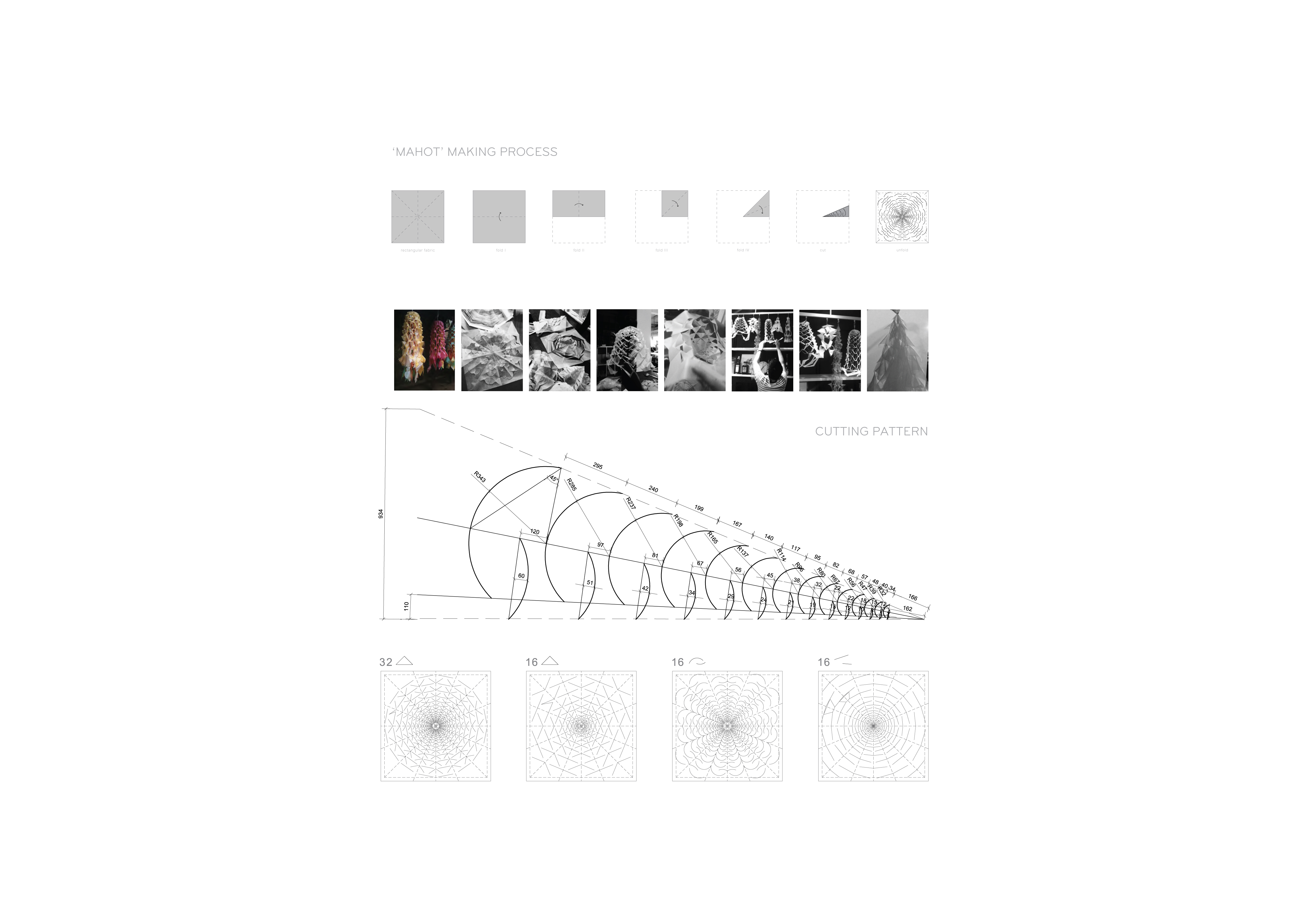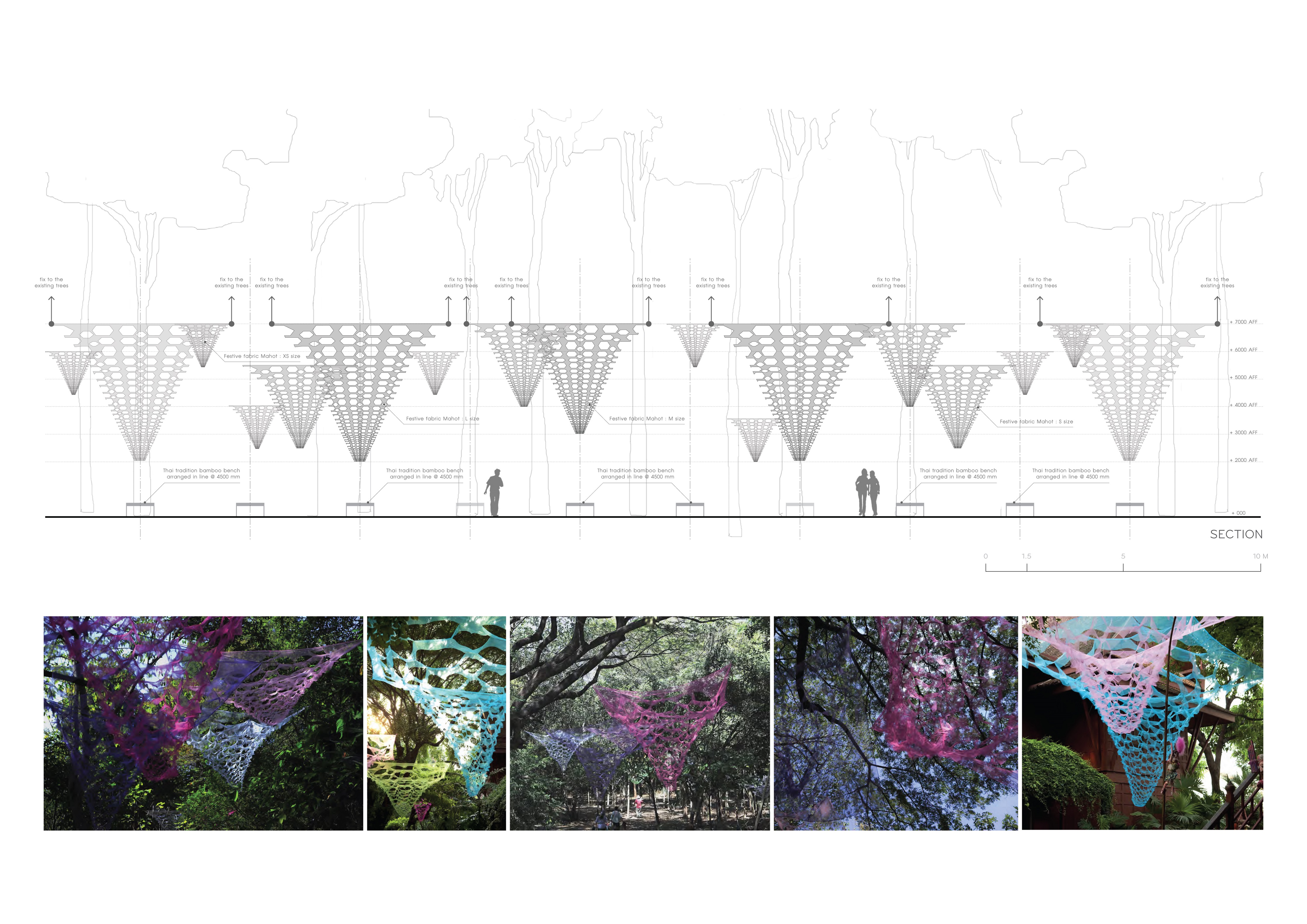 The installation is at Jim Thompson Farm for Art on Farm Project. As architects, our aim for the installation is to define a temporary 'place' for dining in natural environment. The place would bring people to the act of socializing while eating in public naturally, even with strangers. Colorful light structures made out of semi-transparent fabric are added into the existing woods to draw people in and guide their behaviors and movements through the space. Traditional hanging paper-cut decoration, Mahot usually used in a local festival is the starting typology of form for the structure because of its simplicity, playful and locality. The geometry and materiality of the paper cut is studied and developed further in searching for a form that would act the most naturally in the natural setting. With the light and transparent personality of the fabric, the structures move accordingly with the winds and play with the light, as if they were growing out from the nature.