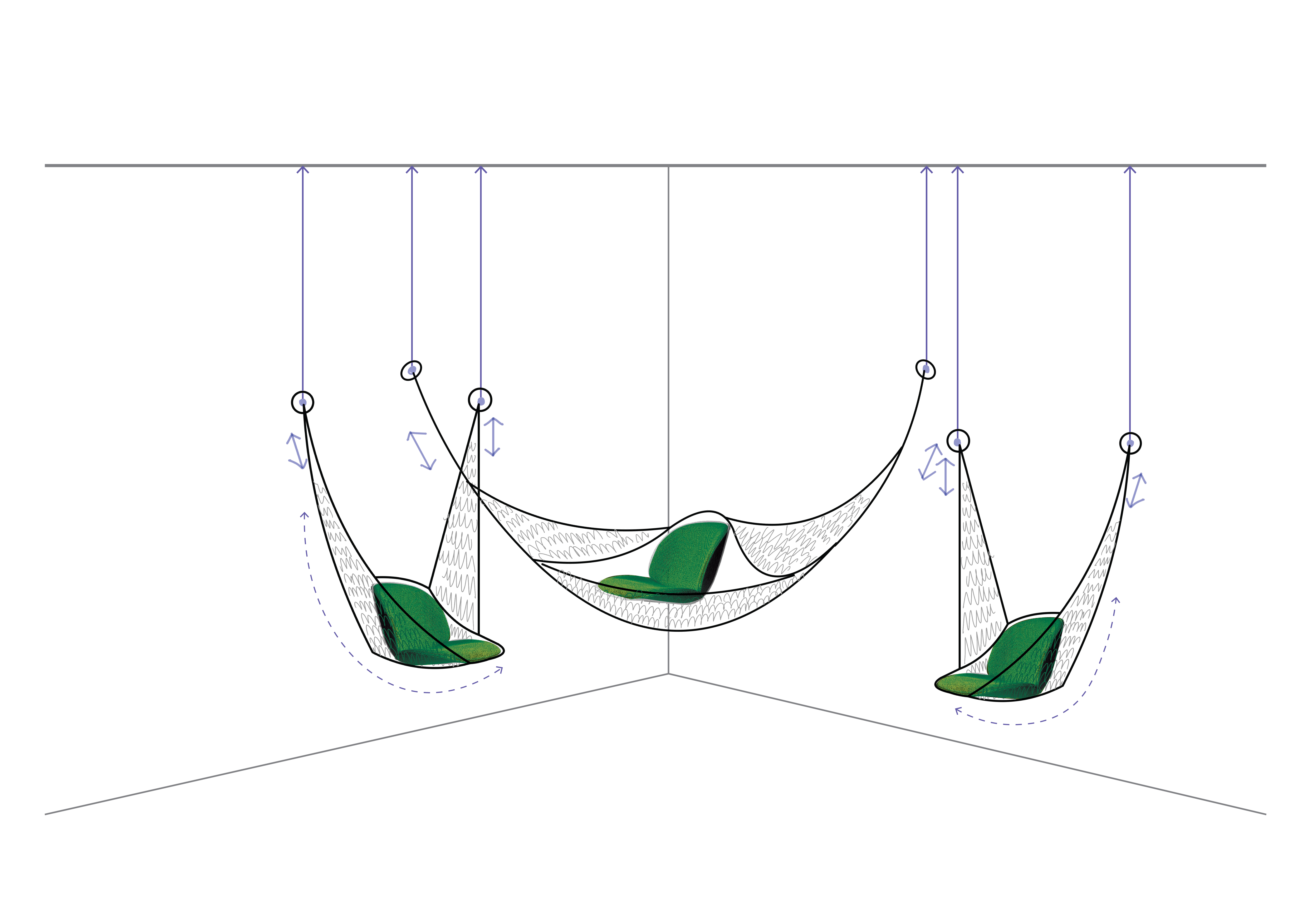 "Flying Beetle" reimagines the Beetle chair in a Thai context where dynamic multilevel seating is natural and ubiquitous. To create a fun and relaxed seating experience, the lightweight, flexibly robust, accommodating Beetle shell is hoisted up in an intricate string 'hammock,' a work in collaboration with Bangkok-based macramé workshop, HandHand Studio.