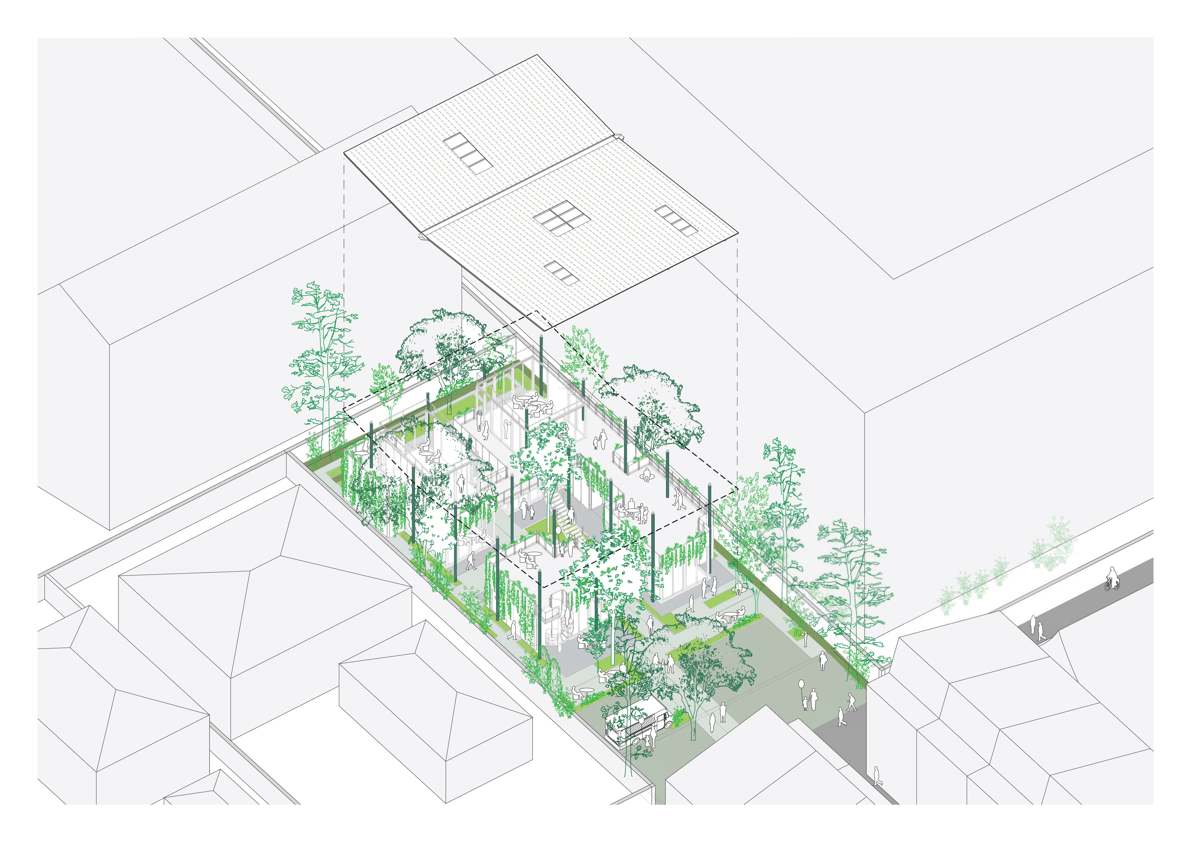 The building sets out as a pavilion in the garden, the basic typology of tropical living, a big roof without walls. By taking advantages from the naturally grown vegetations of the existing, the roof is laid on the site in relation to every found trees to maintain the green oasis condition. The activities with controlled environment are kept minimum and divided into five small boxes under the big roof. The fluid and flexible activities and circulations are placed the space with natural airs in between, in the garden. All opaque walls and fences are designed as the surface to be covered by the vines. The space under the shade in the outdoor airs surrounded by the trees is the key feature to allow people to expose themselves to fresh airs in the concrete jungle.